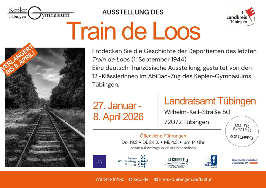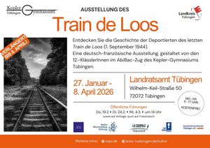 Unsere deutsch-französische Geschichtsausstellung "Train de Loos" kann noch bis zum 8. April 2026 in der Glashalle des Landratsamts Tübingen besichtigt werden. Herzliche Einladung!