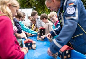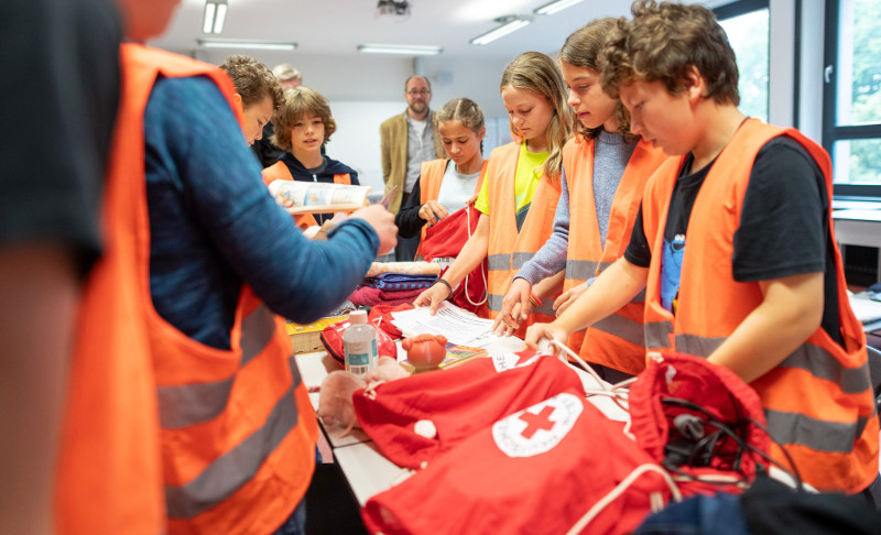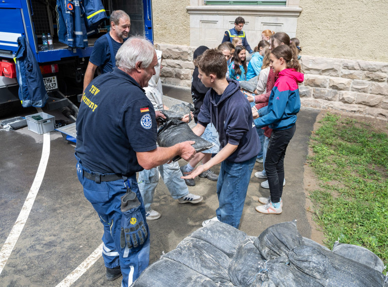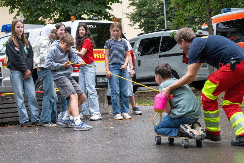 Thomas Mangold von der Feuerwehr Tübingen koordinierte die verschiedenen Retterteams der Feuerwehr, des Technischen Hilfswerkes, des DLRG, des Deutschen Roten Kreuzes, Malteser-, Johanniter-, ASB-Rettungsdienste, welche mit einem beeindruckenden Aufgebot 8 verschiedene Module für unsere Schülerinnen und Schüler zusammenstellten. So gab es z.B. Übungen zum Hochwasserschutz, Rettung durchs Hochwasser, Notversorgung - Erste Hilfe leisten, eine Notunterkunft bauen, eine Klasse evakuieren und vieles mehr….