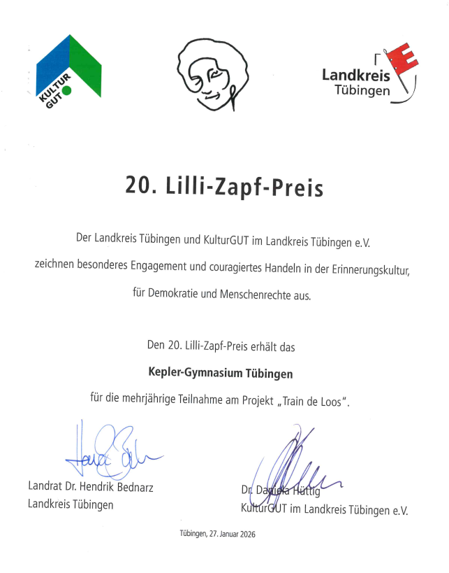 Am 27. Januar 2026, dem diesjährigen Holocaust-Gedenktag, wurde unser deutsch-französisches Geschichtsprojekt „Train de Loos“ mit dem Lilli-Zapf-Preis des Landkreises Tübingen ausgezeichnet! Wir sind sehr stolz und freuen uns, dass die Erinnerungsarbeit, die vier J1-Kurse im bilingualen Zug zwischen 2021 und 2025 geleistet haben, auf diese besondere Weise gewürdigt wird. Der Lilli-Zapf-Peis wird an Jugendliche verliehen, die sich vorbildlich gesellschaftlich und insbesondere erinnerungskulturell engagiert haben.